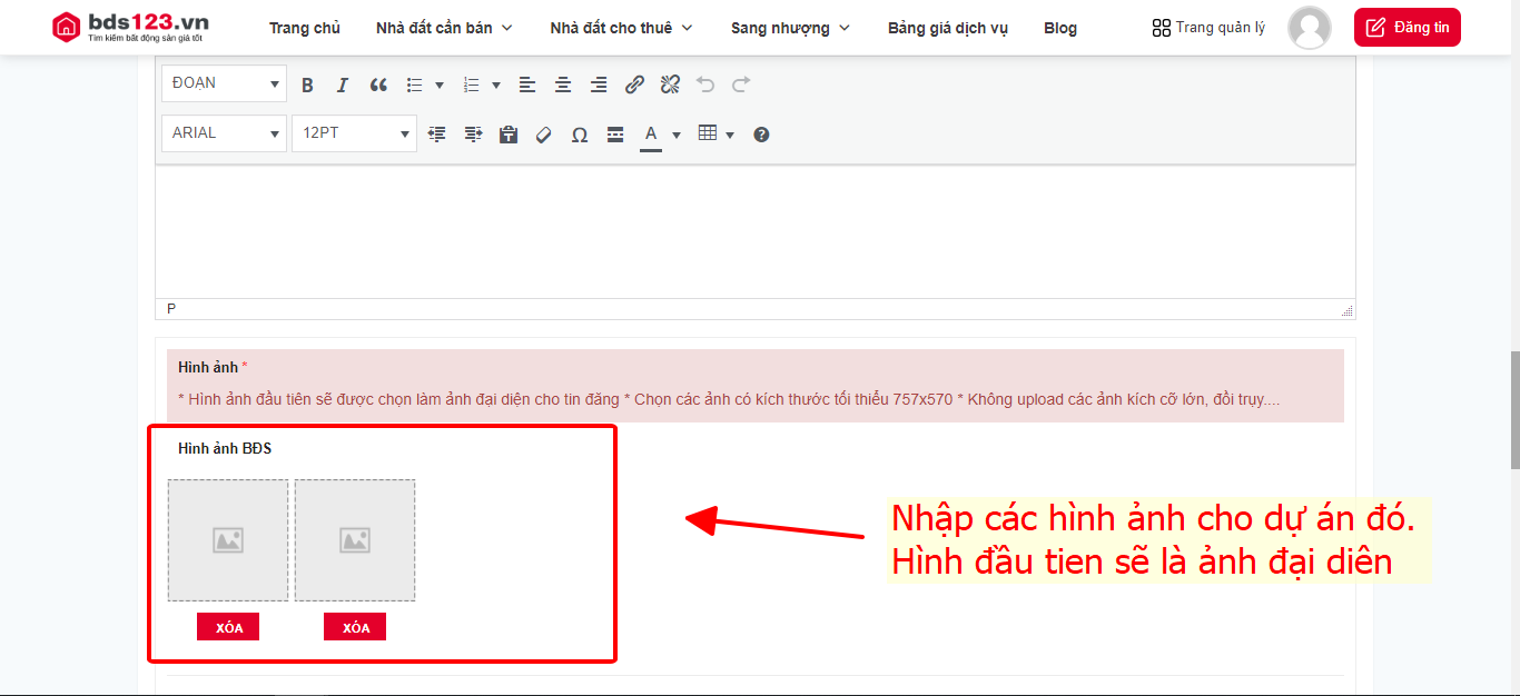 Khi đăng tin các bạn đọc kỹ mô tả từng bước, nhập đầy đủ và chính xác nội dung cho tin đăng, đặc biệt là mục Giá và Diện tích. Những tin có nội dung hình ảnh rõ ràng, đầy đủ sẽ có tỉ lệ xem cao hơn 50%.